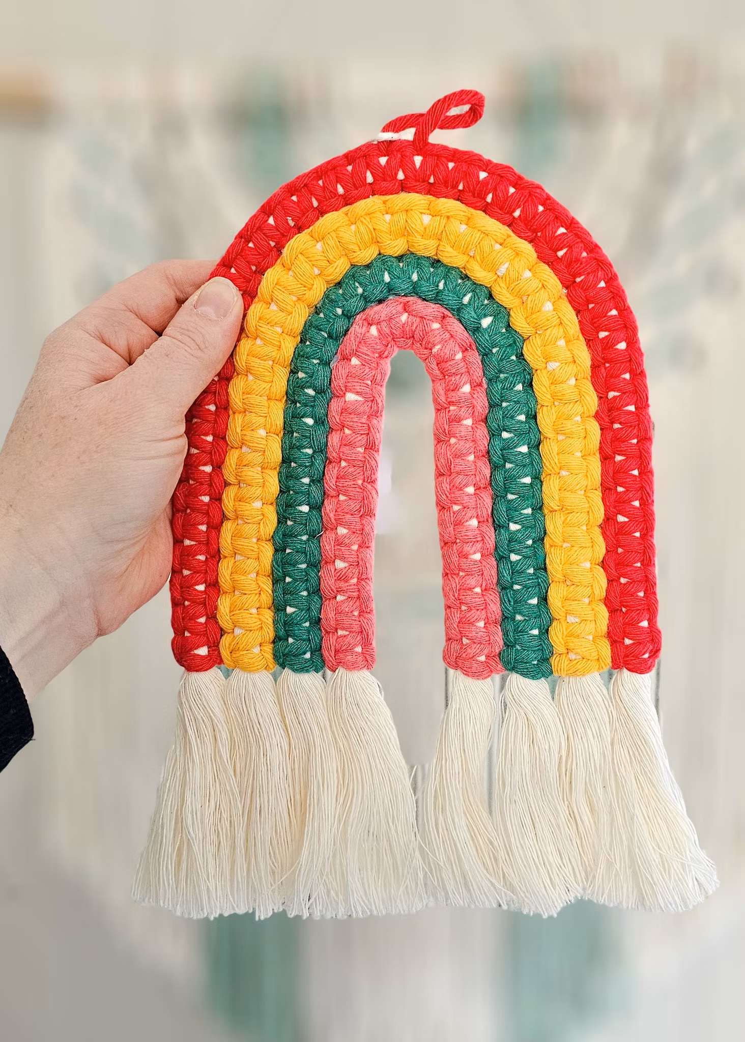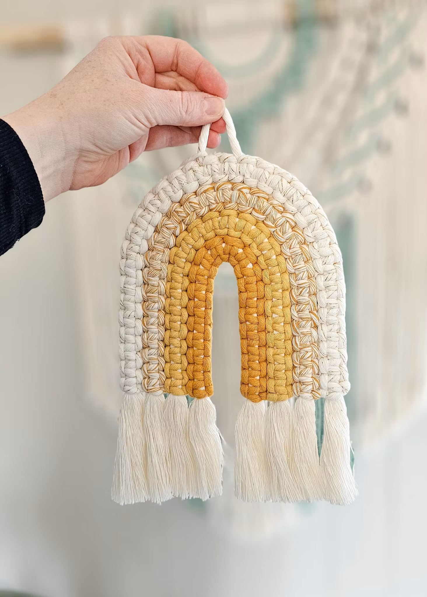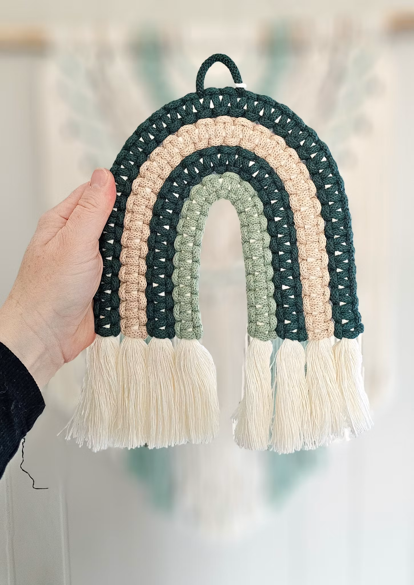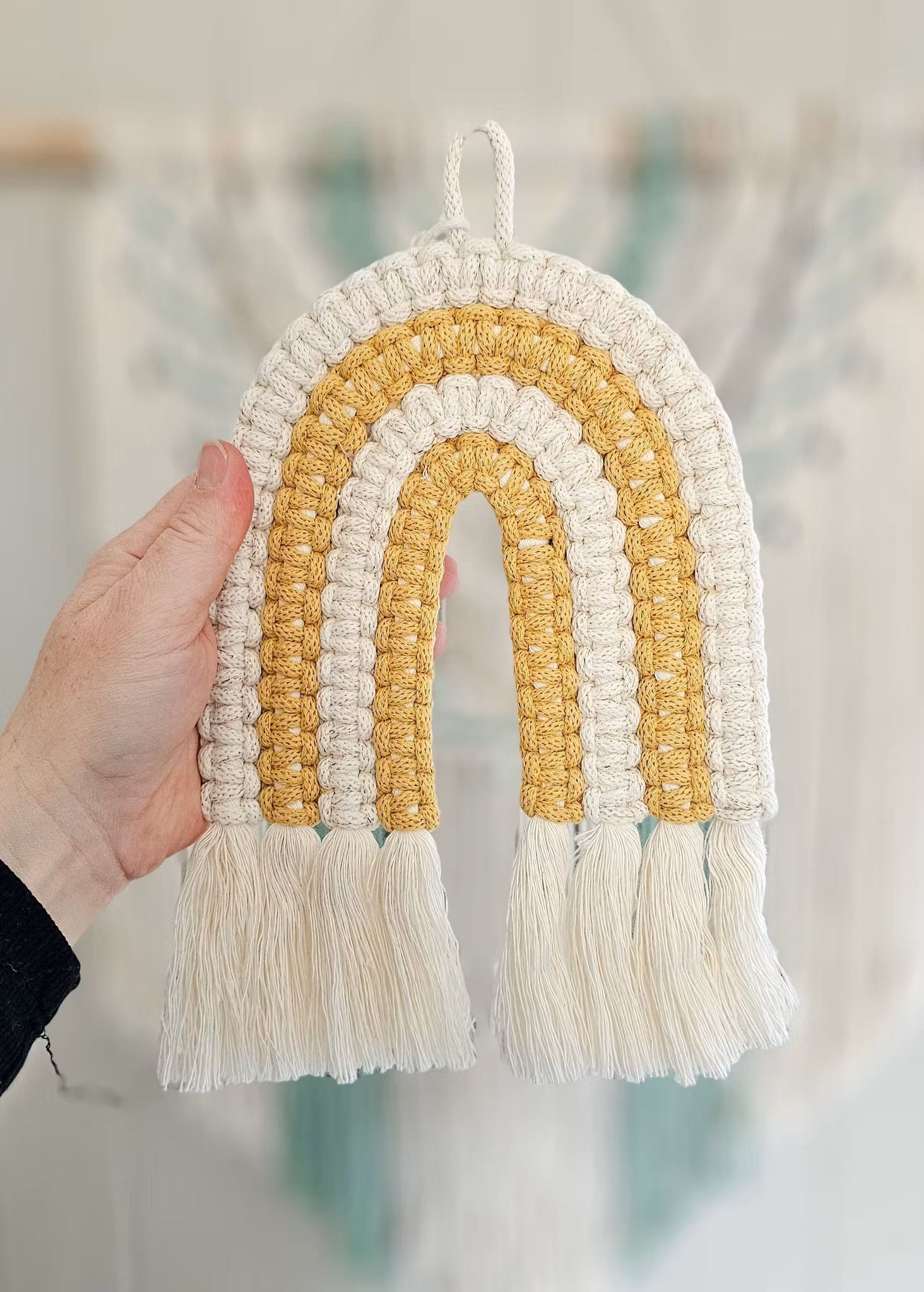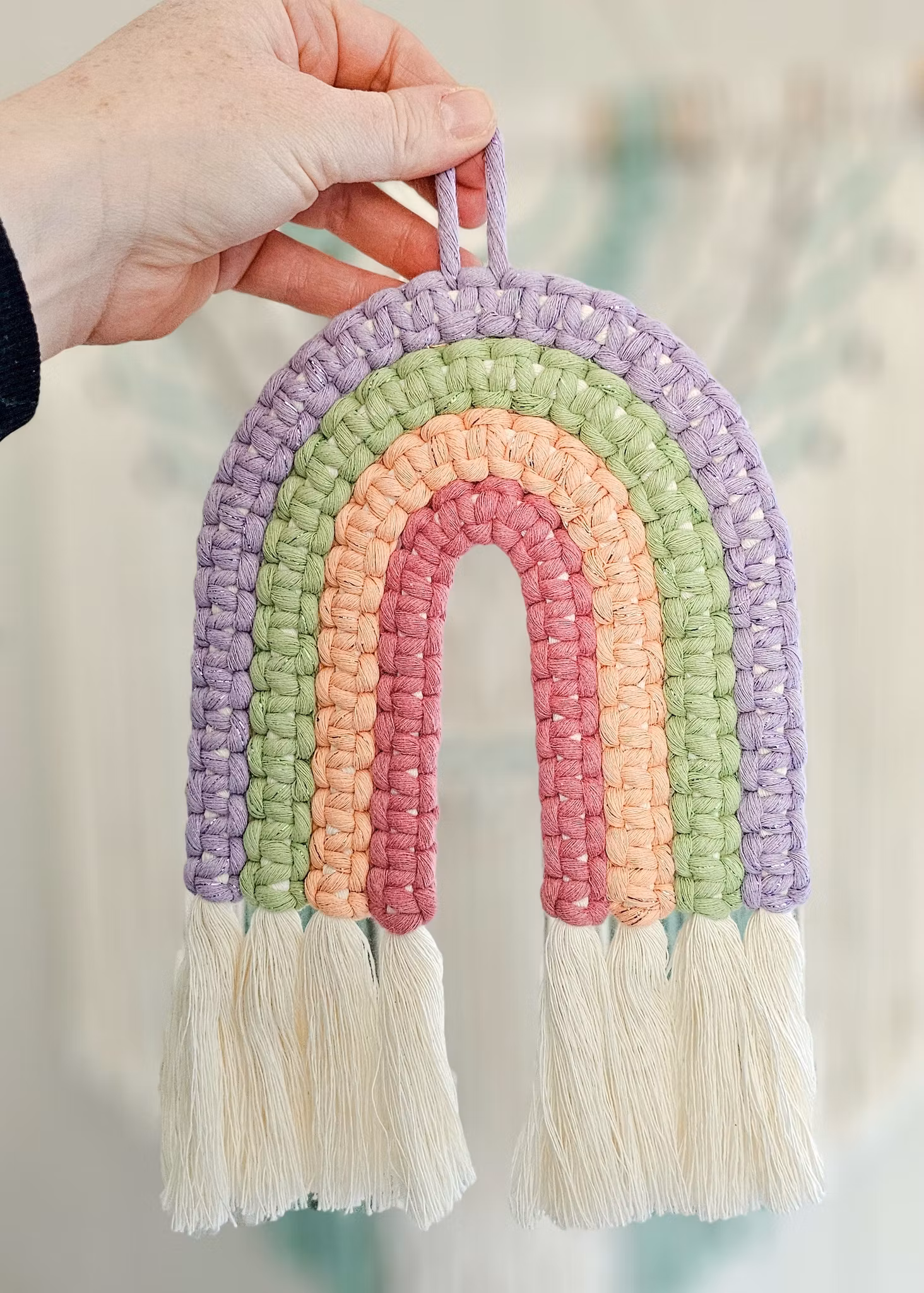 Makramé regnbue 249,- 199,- Farge Lilla/Grønn/Fersken/Rosa/Glitter Rød/Gul/Grønn/Lakserosa Rosa/Rosa/Rosa/Lilla Grønn/Beige/Grønn/Grønn Gullhvit/Gul/Gullhvit/Gul Gullhvit/Beige/Gullhvit/Gul Mint/Grønn/Grønn/Grønn Gullhvit/Gul/Gul/Gul På lager Legg i handlekurv Del Leverandør: Mayas knyterier Produktbeskrivelse Tilbakemeldinger Flotte, håndlagede makramé regnbuer i ulike farger. Brukes som dekor på vegg, for eksempel på barnerommet. Materiale: 100 % resirkulert bomullMål: ca. 27 x 18 cm +/-Selges enkeltvisKan også bestilles i andre farger. Ta kontakt her for forespørsel.