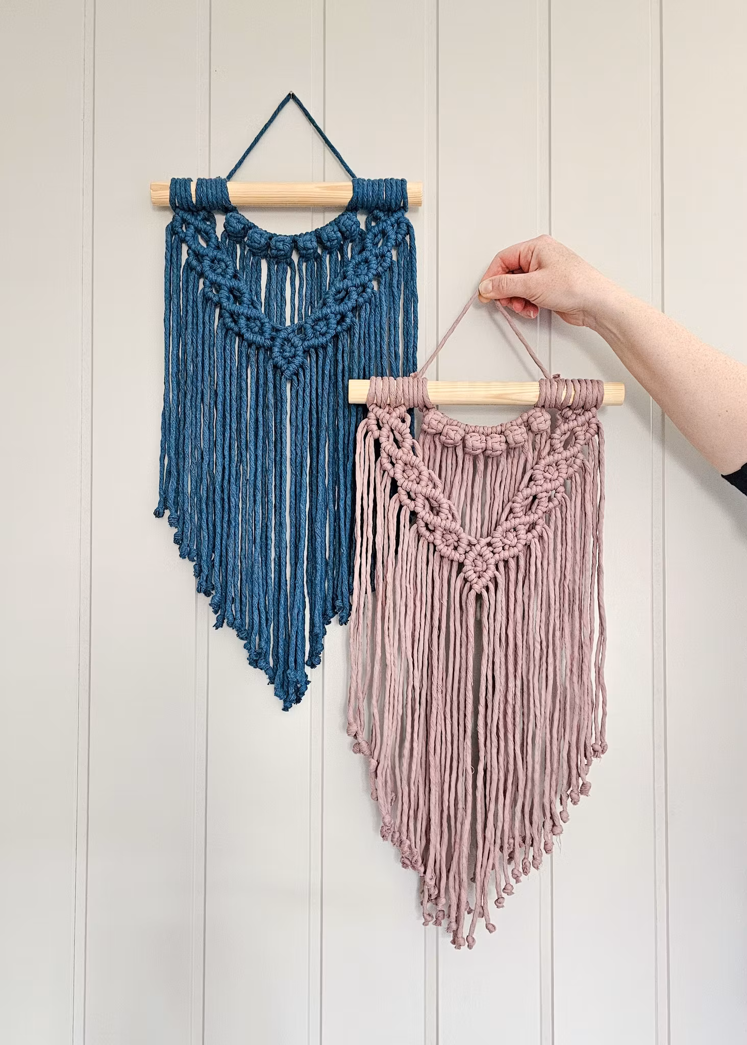 Håndlaget makramé veggheng, klar til å pynte opp hjemmet ditt. Dette vegghenget er laget av 100 % resirkulert bomullstau i 5 mm tykkelse på trepinne. Den nydelig dempede lillafargen, passer ethvert hjem. Vegghenget måler ca. 87 cm fra bunn til opphengssnor, og ca. 27 cm i bredden.
